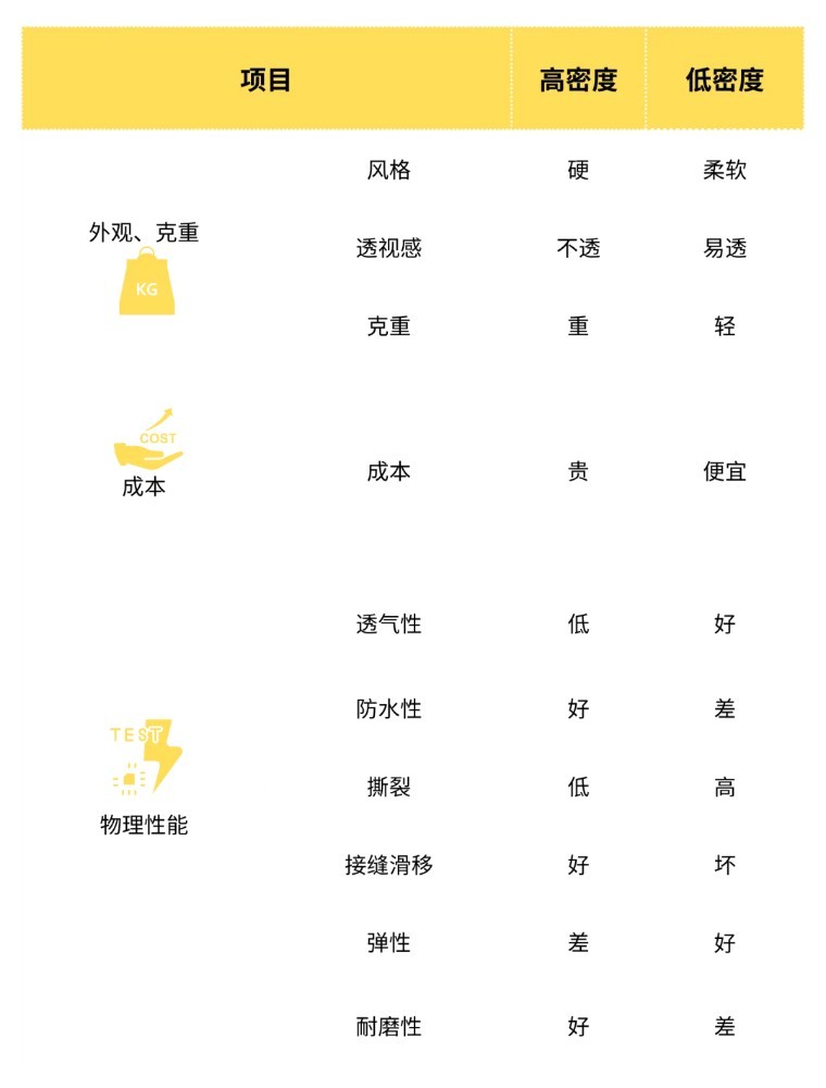 高(gāo)密度和(hé)低(dī)密度面料具體(tǐ)有(yǒu)什(sh →≈én)麽區(qū)别?面料因紗線的(de)特性、組織結構(平紋、斜紋等)而異,所以'±&σ這(zhè)裡(lǐ)僅對(duì)使用(yòng)λ™¶相(xiàng)同紗線、組織結構的(de)面料進行(xíng)比較。